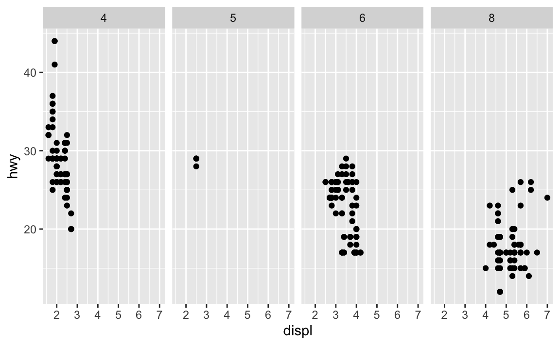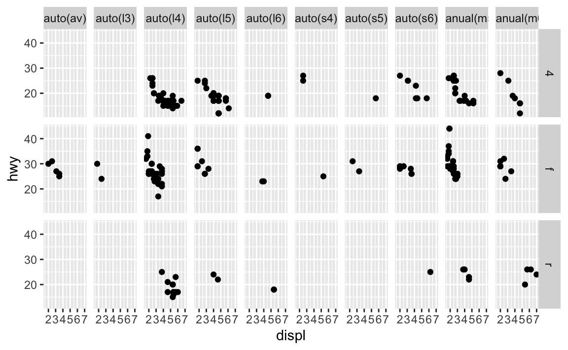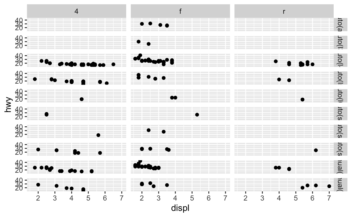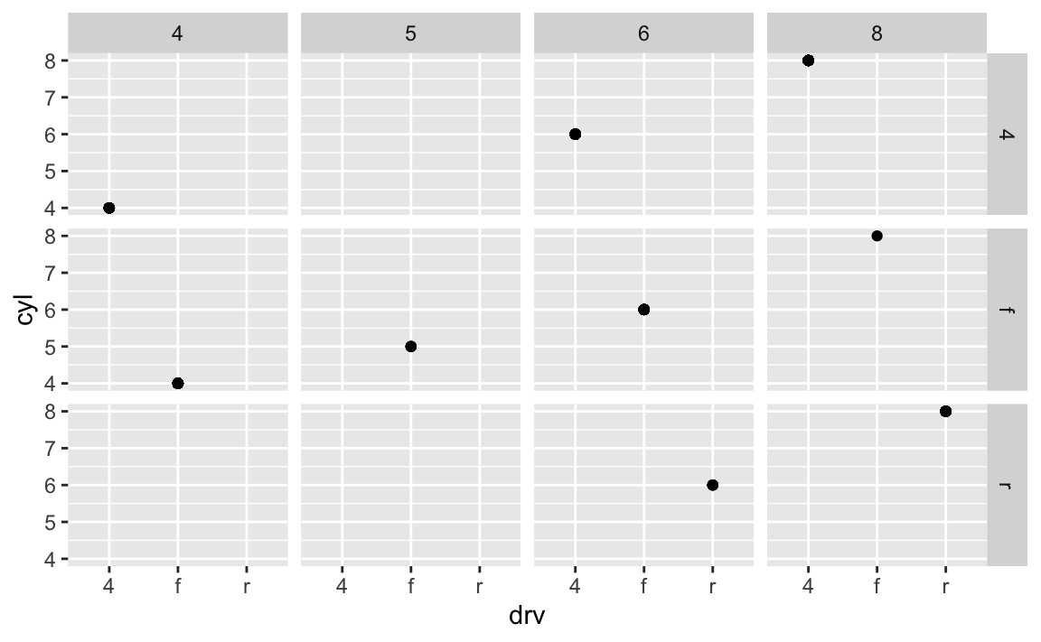 Empty cells mean there are no observations in the data that have that unique combination of values. For instance, in this plot we can determine that there are no vehicles with 5 cylinders that are also 4 wheel drive vehicles. The plot is similar to the original one, just that each facet only appears to have a single data point.