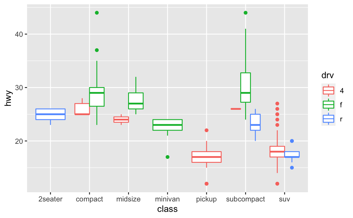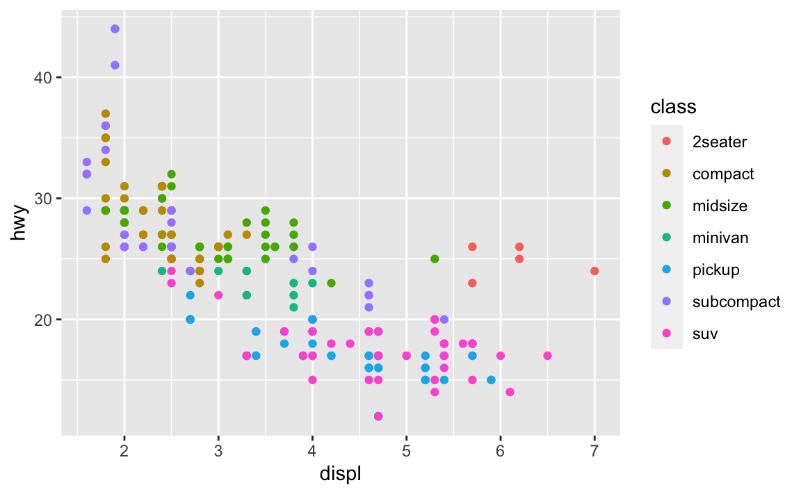 geom_point(mapping = aes(x = displ, y = hwy, color = class))