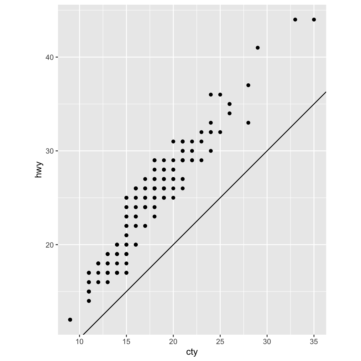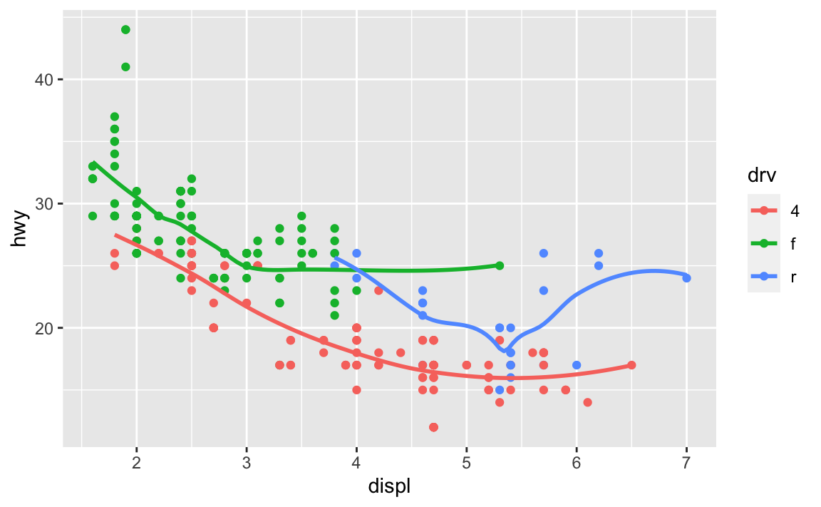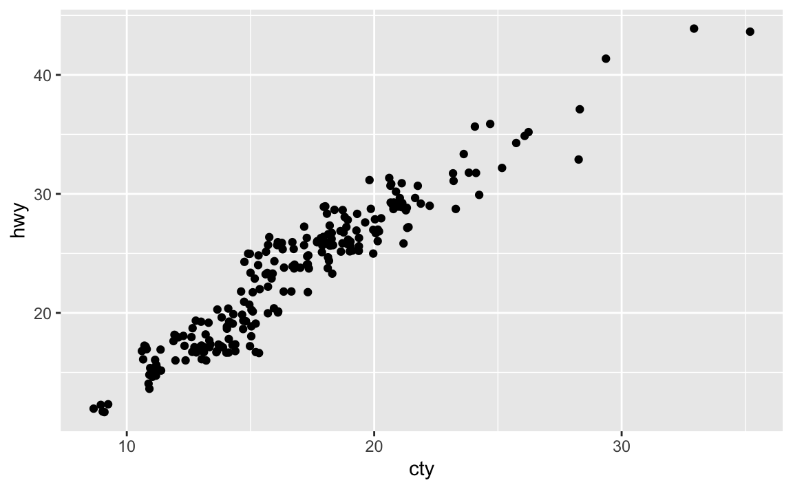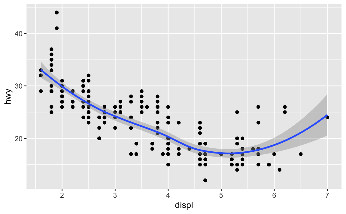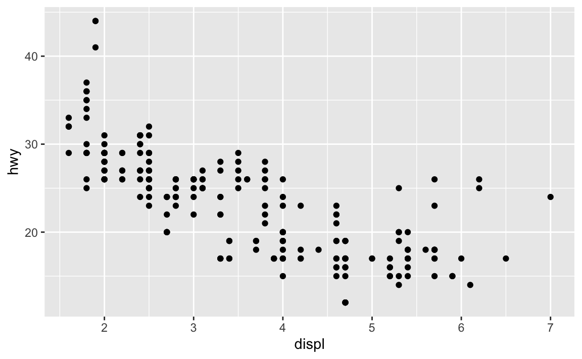 geom_point(mapping = aes(x = displ, y = hwy)) +