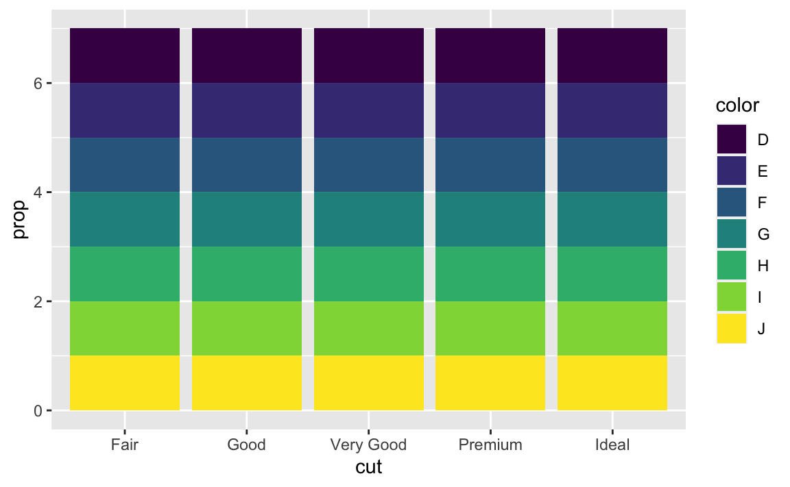 For these aesthetics, continuous variables are visualized on a spectrum (see the color plot with the continuous color palette), whereas categorical variables are binned into discrete categories, like this: