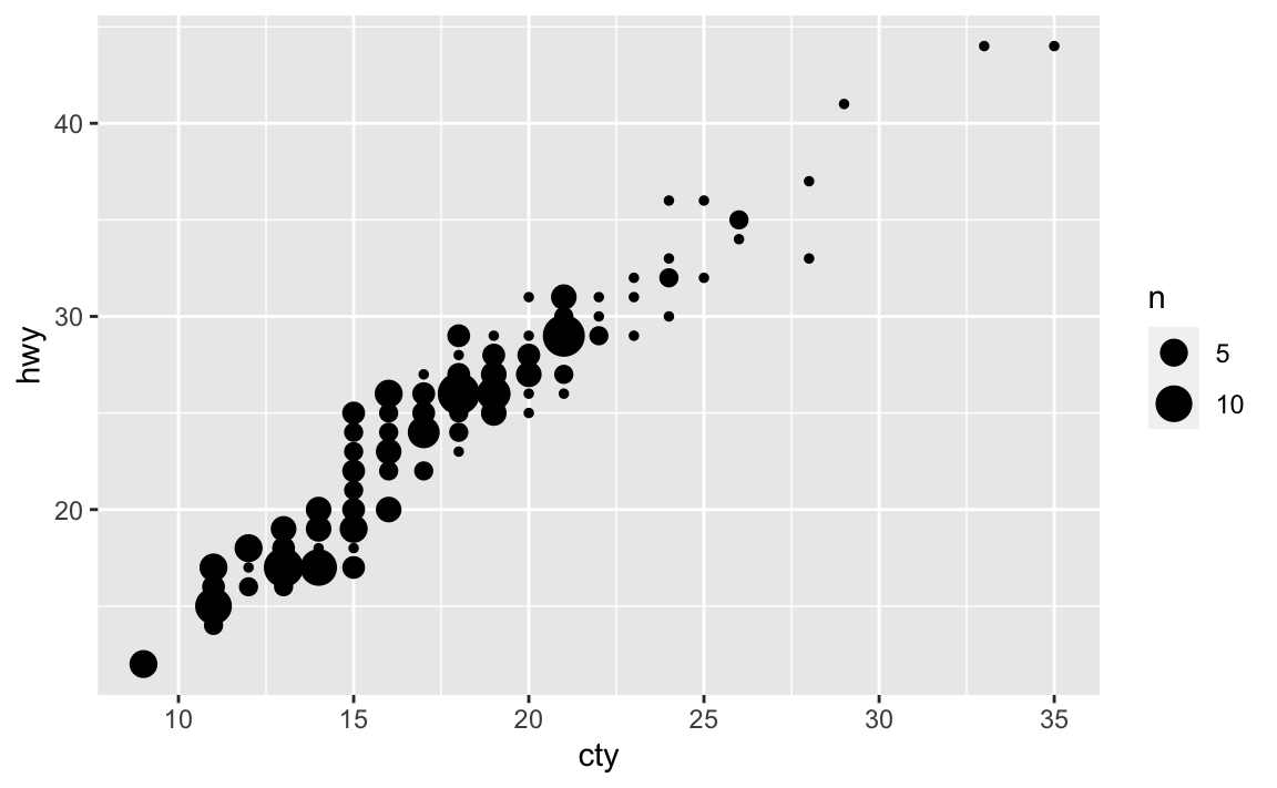 geom_point(mapping = aes(x = displ, y = hwy, size = cty))