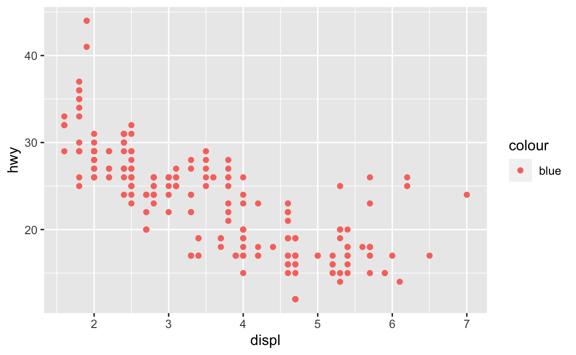 geom_point(mapping = aes(x = displ, y = hwy), color = "blue")